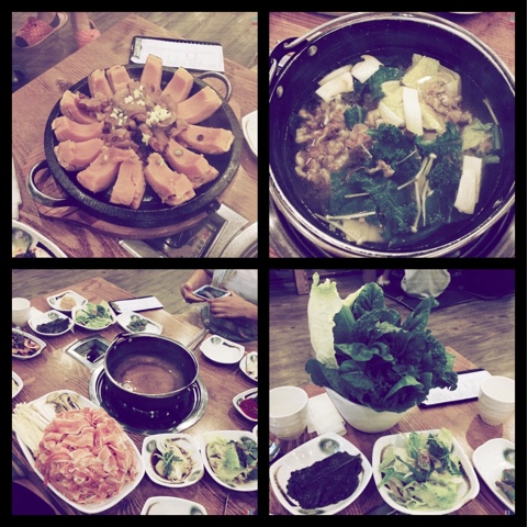 Sometimes we aren’t feeling like a lot of meat, so we choose seafood shabu shabu which is lighter… well, it would be lighter if we didn’t our body weight in side dishes. This particular restaurant is nice because the pot is split in half. So you can actually order pork and seafood at the same time and cook them separately.