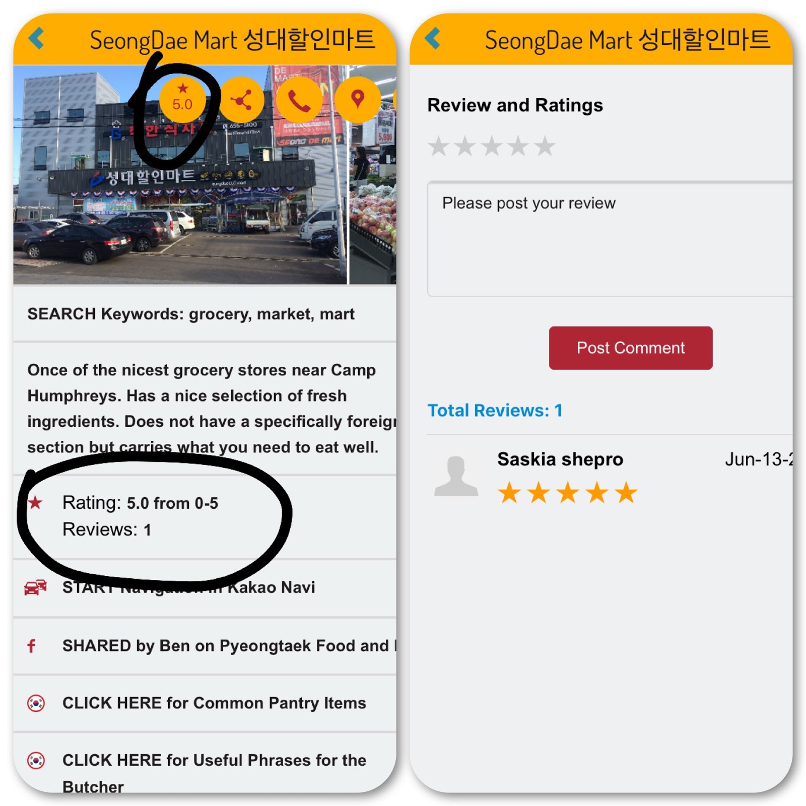 Our listings are filled with useful information depending on topic and availability. It’s surprising how much you can find poking around one of our volunteer created listings. Let’s go on tour together to see what’s up. Since we all need to eat, let’s look at one of the 40+ Pyeongtaek grocery stores we have listed.