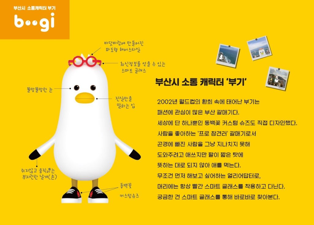 Boogi is the city mascot of Busan. Because Busan is famous for its coastline, Boogi is designed as a seagull. He has bright eyes, wave-shaped hair from the sea wind, and a mouth that only tells the truth.