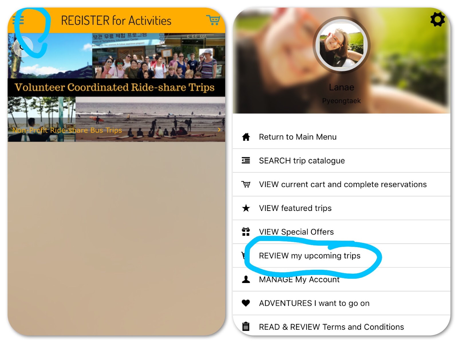 Next you will arrive here. The first thing we want to draw your attention to is up in the left hand corner. See those three little lines? That’s where you can now go to confirm your payments have been received. In addition to being able to see it in the app, you will also get a confirmation email once we have received your payment and added you to the ride-share Departure Roster.