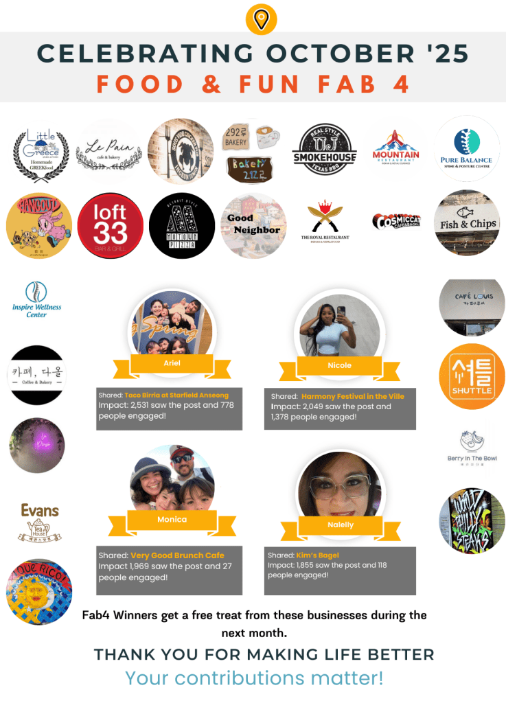 We are happy to announce our Pyeongtaek Food & Fun’s Fab 4 October 2025 winners for their valued participation. Winners for September 2025 can collect their awards during November 2025.