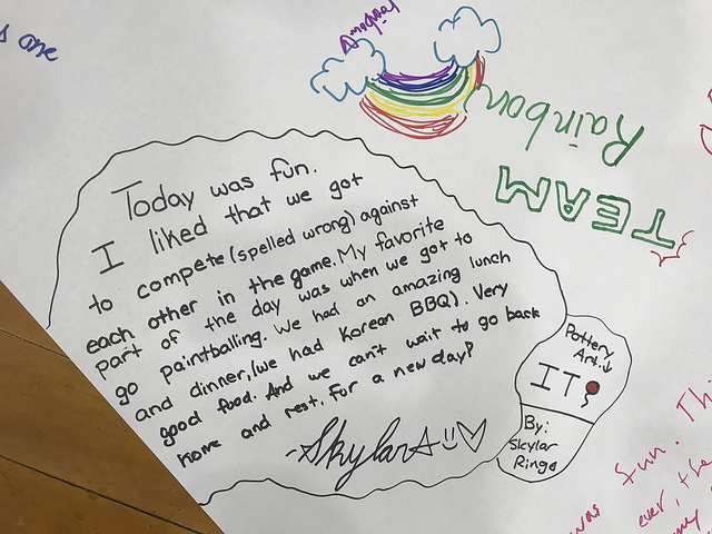 Next, we moved further down the hill to the Survivor Course where students and teachers played two games of paintball. This was so much fun! In fact, all the kids who asked not to play paintball completely forgot they didn’t want to play by the time we got there and charged out onto the course. That’s when you know you’ve won their hearts. When they completely forget to hate things.
