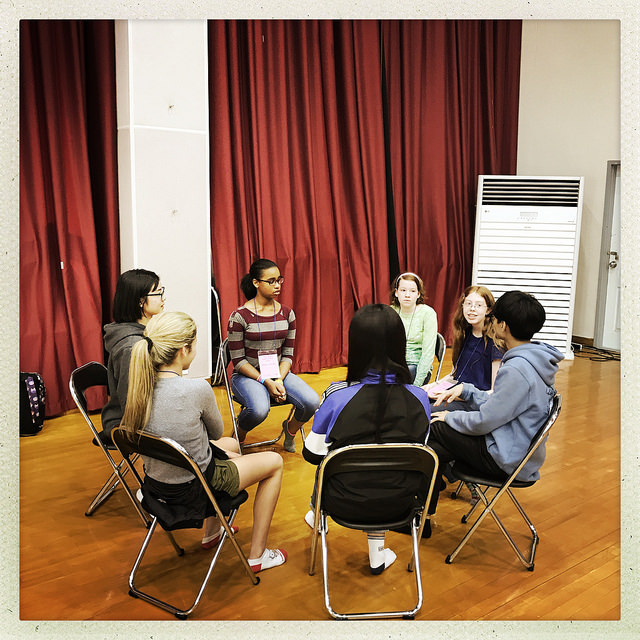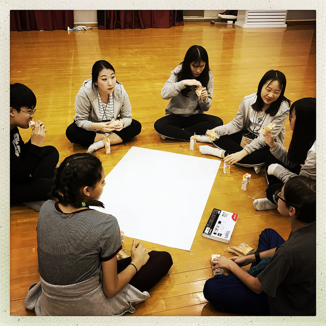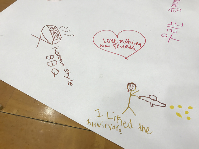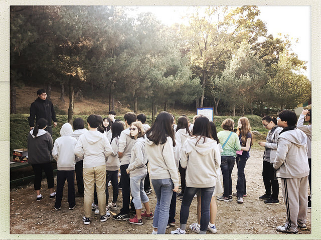 The first day of camp started off by picking up the kids at 9:00 a.m. and then heading off to MooBong Youth Camp where we spent the morning in small groups getting to know each other and planning some simple team building games. It was the perfect low level start needed to bring the students together and encourage participation. The counselors were very good at their jobs and coaxed out the best in all the students so that they easily and quickly worked together. You could feel the stress and anxiety of being in a new place just slip away as the kids came out of their shells.