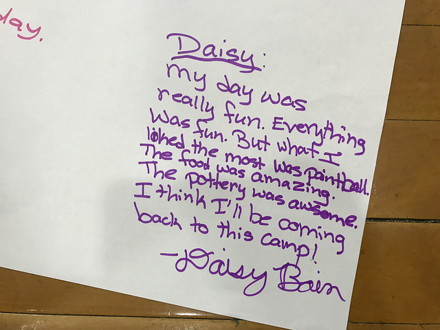 After lunch, students moved from the auditorium to the lower area of camp to paint pottery that will be fired and delivered to them in a few weeks. Kids learned about the full process of creating pottery before getting to paint both a cup and plate for home. For the creative types, this was the activity highlight of the day.