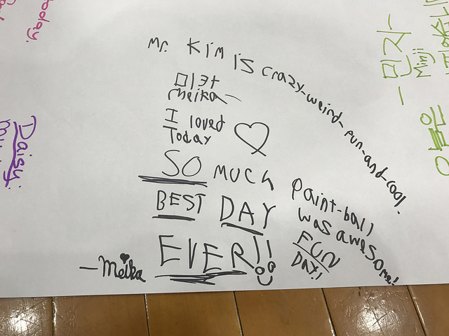 After paintball we returned for dinner in the park, which was a feast of Korean BBQ, and then back to the gym for another few hours of playing and games before we headed to bed at 9 p.m. We have no idea how the kids lasted so long without completely melting down, but they did and it was awesome.