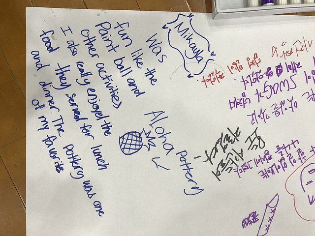 The first day of camp started off by picking up the kids at 9:00 a.m. and then heading off to MooBong Youth Camp where we spent the morning in small groups getting to know each other and planning some simple team building games. It was the perfect low level start needed to bring the students together and encourage participation. The counselors were very good at their jobs and coaxed out the best in all the students so that they easily and quickly worked together. You could feel the stress and anxiety of being in a new place just slip away as the kids came out of their shells.