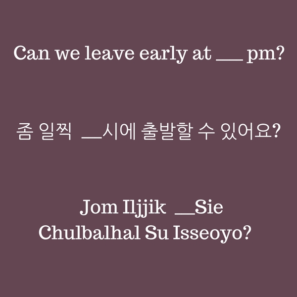 In Korea one of the coolest things is how easy it is to charter a bus and do a group tour. It’s crazy affordable. Usually between 300-550,000 won depending on the size of your bus (24 or 44 people) and where you are going. The one hurdle that foreigners will have when booking a bus is communicating easily with the driver. Since we are all about empowering everyone to get out and enjoy all that Korea has to offer, here is a set of phrases to help you feel confident in booking a tour for your friends and co-workers and seeing the country on your own terms. (Some of these are specific for Pyeongtaek).
